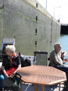 Zu guter Letzt nimmt uns die Schleuse in Sarralbe auch noch in Geiselhaft – das Ausfahrtstor will sich nicht öffnen. Es ist 12.30 Uhr – bei den VNF nimmt niemand den Protest entgegen. Also in der Schleusentiefe (wenigstens ist es hier windstill) das Ende der amtlichen Mittagspause abwarten. Um 13 Uhr wird dann der Anruf erhört und Hilfe ist rasch zur Stelle.