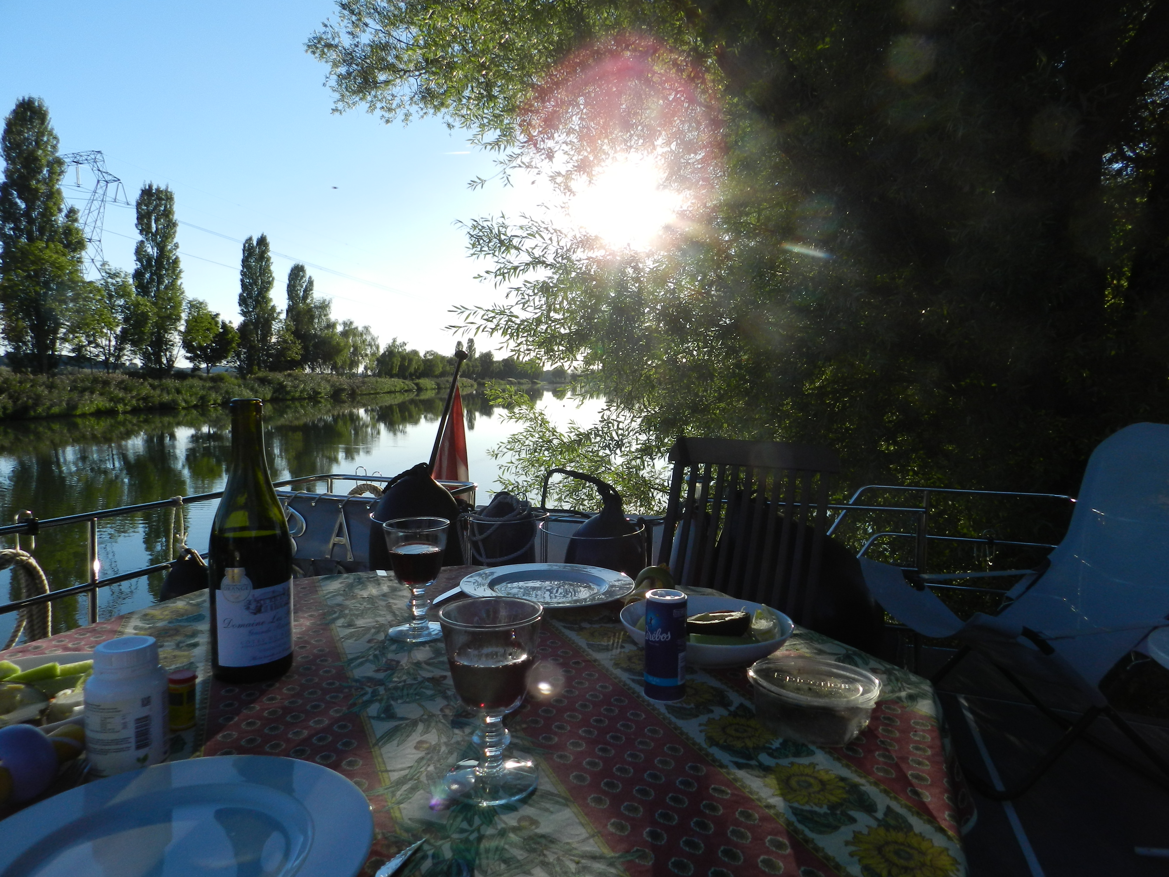 Knapp 2 Stunden später legen wir am Steg nach der Schleuse 16 an – der ist noch frei – und kommen etwas verspätet doch noch zum Mittagessen (mit klassischem Dreigangmenu: Brot, Käse und Wein). Und am Abend natürlich zu einem Nachtessen im gegenüberliegenden Restaurant…