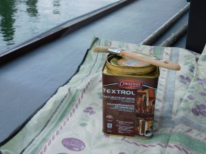 Und hier absolvieren wir auch unsere immer wiederkehrenden bricolage- Stunden – diesmal mit Oelen des Steuerhaus-Holzes.