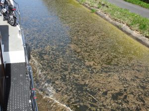 Die blühende Natur (und der zum Durchspülen fehlende Verkehr) führen zu einer zweiten Blütenpracht auf dem Kanalwasser (ja – und dann halt auch im Kühlwasserfilter…).