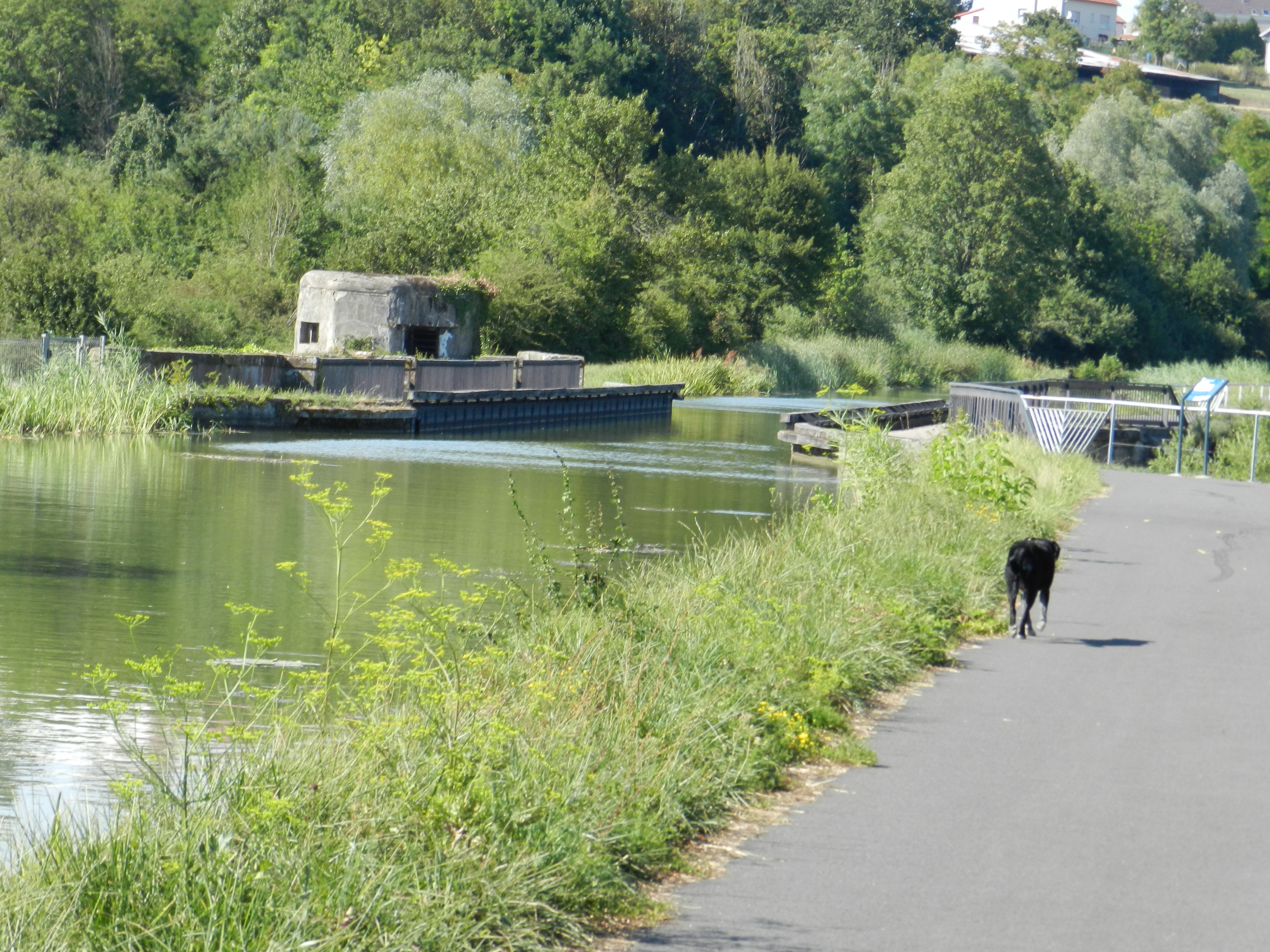 Auf der Fahrt auf dem Saarkanal sind beim Passieren der „trouée de la Sarre“ Einrichtungen der „Ligne Maginot aquatique“ zu sehen.